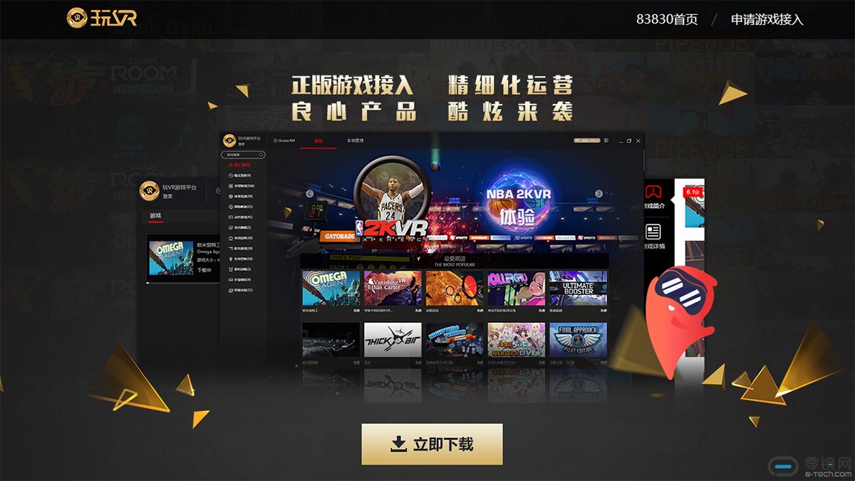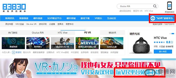 我们很好奇,哪里可以找到这么神奇的平台?根据这位开发者的指点,我们打开了83830的官网,然后点开了右上角的“‘玩VR’游戏平台”页面。这个入口隐藏的还挺深,不注意还真不容易发现。