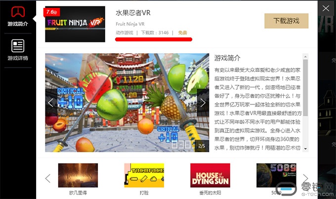 当然,我们还是要打开这个“玩VR”软件看一看才行,万一我们猜错了呢?然后,我们发现这里竟然可以下载到免费版的《水果忍者VR》?还有免费版的《亚利桑那阳光》?