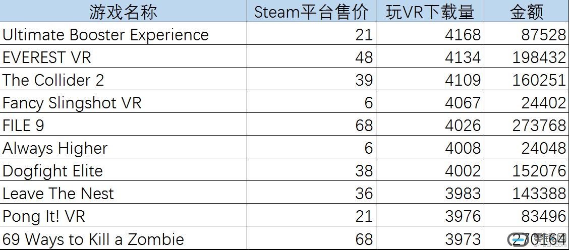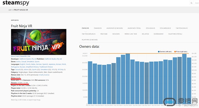 这两款游戏在Steam上可是妥妥的付费游戏,售价分别是48元和112元人民币。在“玩VR”平台上,这两款游戏则是完全免费的,而且我们看到《水果忍者VR》这款游戏在“玩VR”平台上的下载数量超过3400次,而steamspy上查询到的正版销售数量也只有33849个左右(正负5199),也就是说这一个平台的盗版比例就高达10%。