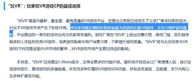 这么一款“无私”的平台为什么会出现呢?它出现的初衷是什么呢?既然软件的宣传口号是“正版”、“良心”,那肯定会有正版接口的。而我们在软件页面上也正好找到了“申请游戏接入”的按钮。在这个页面,“使玩家用最实惠的价格体验最为优质的正版VR游戏,支持与维护游戏版权。”这句话,很像当年中国软件行业9.9元正版光盘行动的理念。