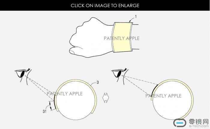 另一方面,苹果之前也曾发布过概念类似的专利申请,同样采用环形曲面屏幕设计,不过苹果的设计是以用户的手腕为中心进行环绕。