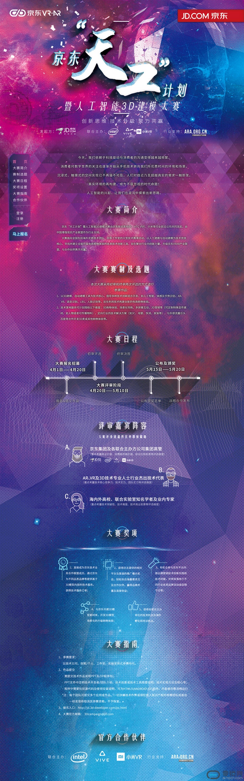 近日,京东正式发布京东“天工”计划,该计划旨在聚合AR、VR行业内创新力量、升级京东VR/AR产业联盟、打通内外合作链路、引领未来购物场景,为合作伙伴创造多元价值,并构建京东全品类3D数据库,开启3D商品展示的大门,让消费者能拥有更加真实、自然的商品浏览体验。为全面落实这一计划,京东将于4月初发起一场人工智能3D建模PK大赛,向手工建模发起挑战。大赛由英特尔、HTC VIVE、小米作为联合主办方,由中国增强现实产业联盟(ARA)作为行业特别支持。