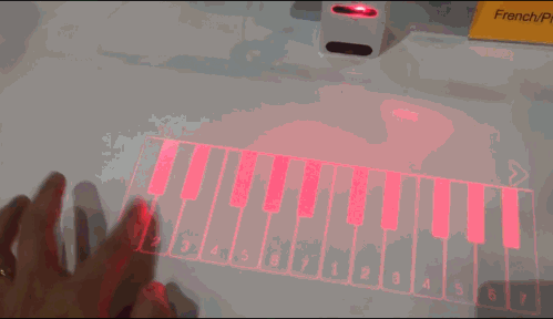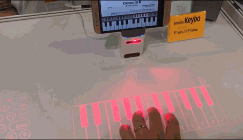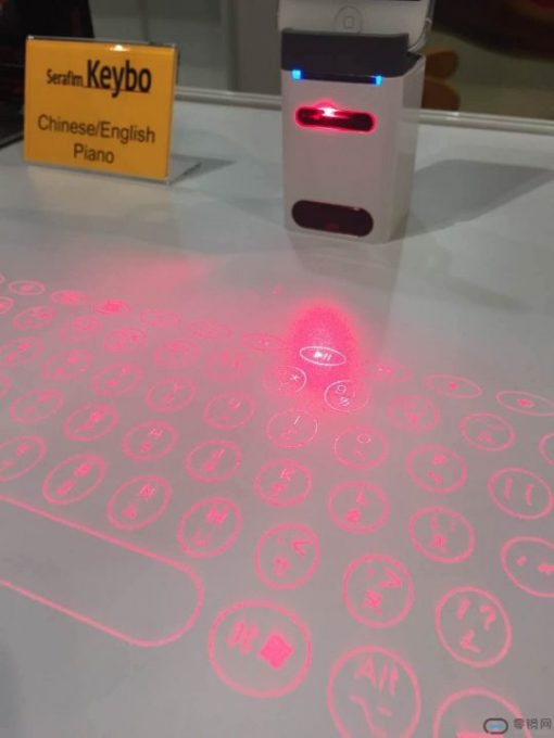 投影键盘:这是一家台湾厂商推出的产品——投影键盘。它利用光学投影和视觉技术捕捉人手指的动作,在一块平整的表面虚拟出一个可以输入的键盘。看上去很科幻,售价99美金。