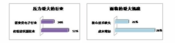 当前全球经济复苏乏力,对于未来5年的贸易前景展望,受访企业持中性态度的占47%,有点悲观占比20%。同时,2017年中国经济面临下行压力,部分制造企业仍将在深水区前行。其中,传统纺织服装业面临压力最大(52%),其次是消费类电子行业(24%)(见图三。)