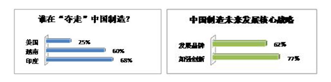 受访企业认为现今的印度(68%)、越南(60%)以及美国(25%)是目前“中国制造”的强有力对手(见图一)。环球资源首席执行官裴克为(Craig Pepples)?先生对此表示:“目前‘中国制造’在全球贸易中处于‘三明治’格局。因为我们过早的进入了低成本的挤出效应,前有印度、越南一些自然资源丰富、人工成本相对低廉的国家正在快速取代我们;后有美国通过制度、体制的创新,实现高端回流,我们没有主 动权和主导权。值得欣慰的是,我们看到中国企业已然意识到加强创新(77%)、发展品牌(62%)是‘中国制造’应对诸多挑战、开启未来发展新格局的核心战略(见图二)。”