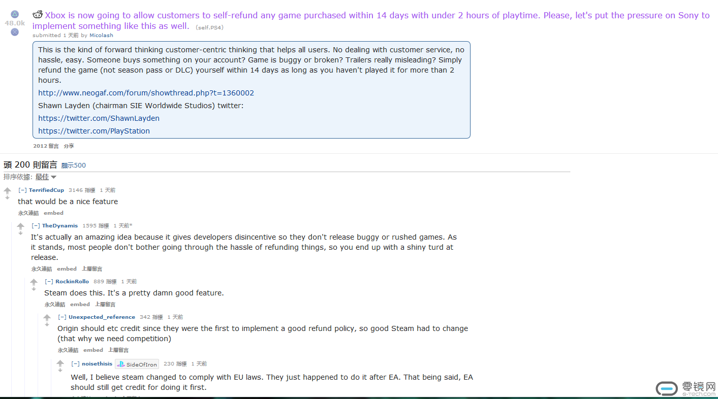 这一话题已经成为了Reddit社区PS4子版块的史上最热门话题,主帖话题为“Xbox现在能够在14日内为游戏自助退款,也请大家给索尼也施加点压力吧。”