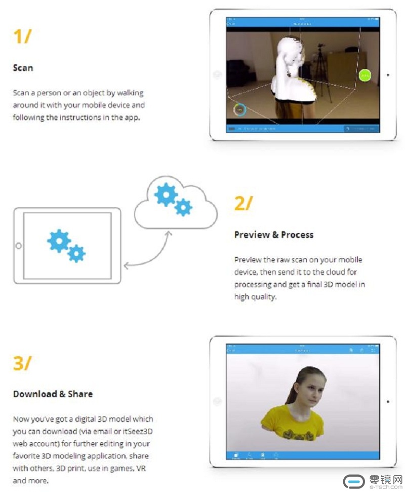 在移动设备上预览未加工画面,再上传至云中进行处理获得高质量的3D模型。