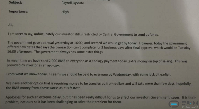 大卫称,刚刚开始欠薪的时候,Adam还给他们发过许多邮件,这些邮件往往把欠薪归咎于银行或者政府的拖延。在这期间,公司还发放过“来自投资人道歉”的2000元的补偿。