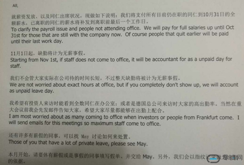 当时Adam说得很乐观,说他正在找投资,如果德国继续欠薪,我们可以找一个“干爹”。但后来8月的工资也没发。等到9月的时候,德国打钱过来,公司把我们7月的工资补上,之后就再也没发过工资了。
