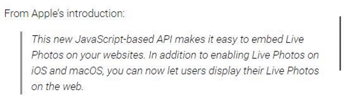 在Tumblr对全网开放Live Photos之后,苹果也发布了官方的Live Photos的JavaScript API。开发者可以直接使用这个应用接口程序API来分享Live Photos,不仅可以在iOS和macOS上,如今已经覆盖全网用户了。
