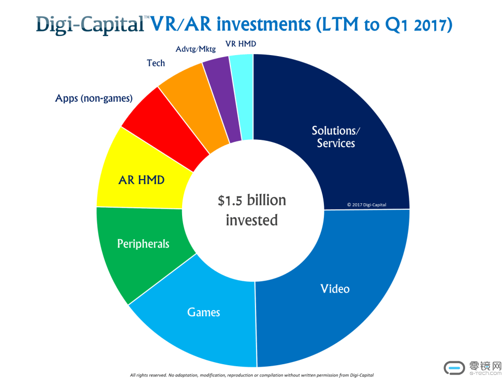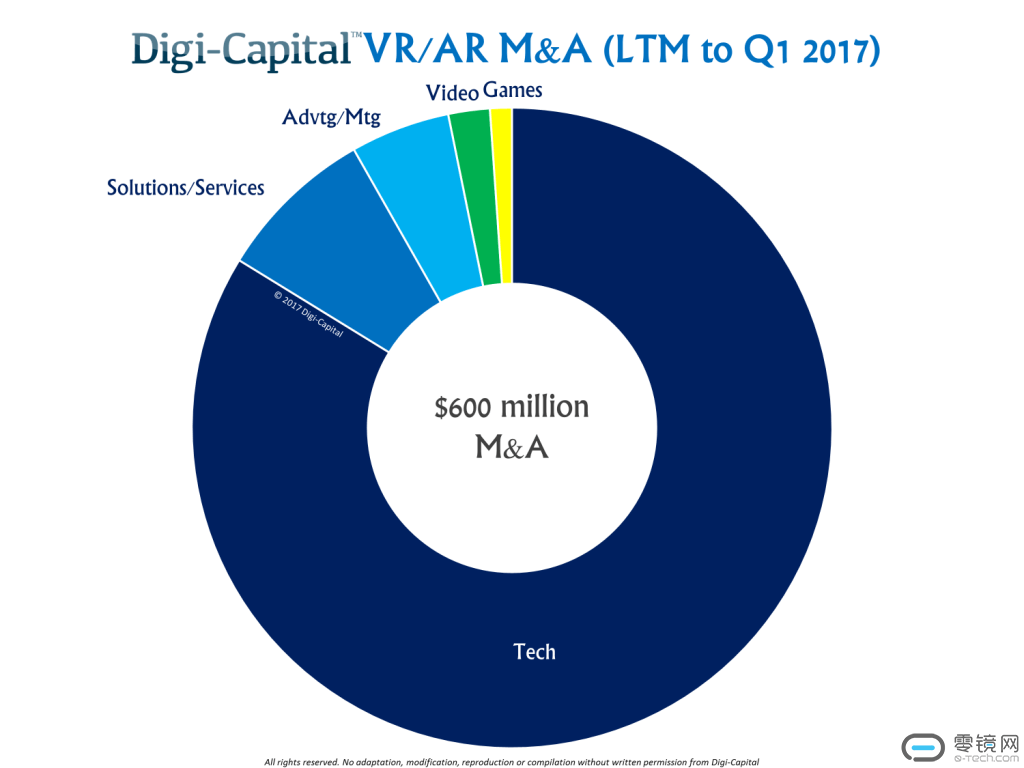 在Digi-Capital的“2017年VR、AR 1季度报告”中,指出交易数据库现在知道2017年Q1季度的过去12个月内,累积出现15亿美元的投资,同一时期并购额仅6亿美元。投资的动力超过并购是科技市场处于早期阶段的典型表现,交易用于投资增长而非巩固优势或者控制成本。