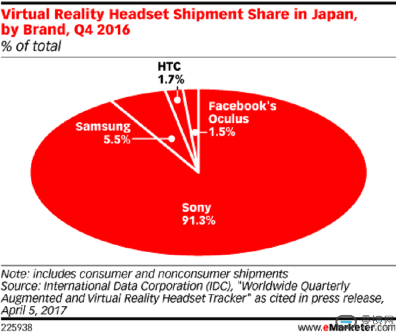 随着HTC Vive、Oculus Rift、PS VR的诞生,2016年当之无愧为虚拟现实元年。索尼头显虽然较晚进入市场,但有着PS4安装基础的PS VR成为了较易被采纳的设备。eMarketer的报导收集了来自IDC的数据,发现截止到2016年Q4季度,PSVR出货量占到日本VR头显出货总量的90%。而在今年二月下旬,索尼也证实目前出货将近100万台。PS VR似乎正成为日本沉浸式移动的代表设备。