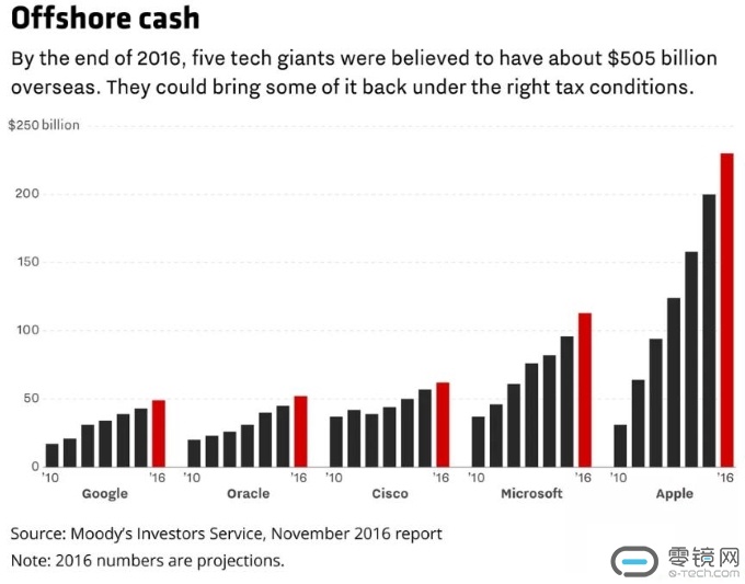 根据去年Moody’s Investors Service的分析显示,谷歌、Oracle、Cisco、微软和苹果5家公司的海外收益超过5050亿美元。