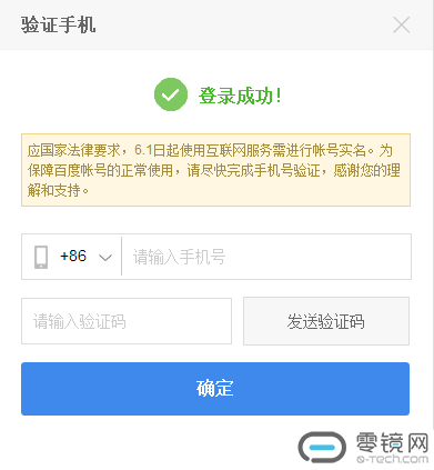 “应国家法律要求,6月1日起使用互联网服务需进行帐号实名。为保障百度帐号的正常使用,请尽快完成手机号验证,感谢您的理解和支持。”