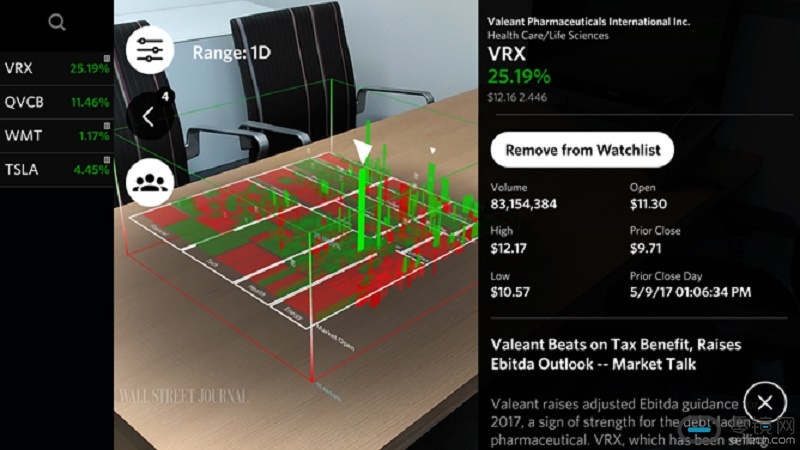 华尔街日报日前发布了一款名为WSJ AR(WSJ,即华尔街日报)的安卓应用。这是一款增强现实应用,允许用户通过Tango手机对美国股票市场进行可视化浏览。除了观察整体市场表现以外,也可以进行放大查看个别股票的细节,查看与选中股票相关的新闻提要并保存等。