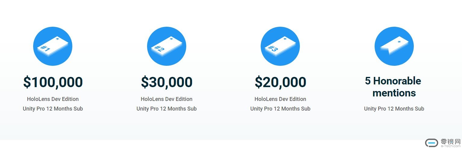 微软和Untiy将评断最终的应用,选出胜利者,这名开发者将获得10万美元现金奖,价值3000美元的HoloLens开发者套件,还有12个月的Unity Pro订阅服务。另外我们发现,第二名和第三名可以分别获得3万、2万美元现金奖,同时包括价值3000美元的HoloLens开发者套件,还有12个月的Unity Pro订阅服务。