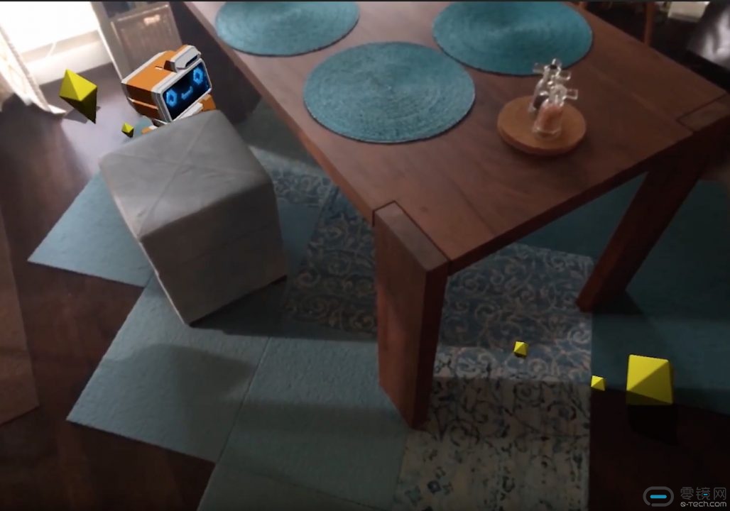 Occipital的DEMO应用放了一个小机器人-Bridgt-进入房间中,你能使用Daydream样式的控制器进行交互。你能通过指出和点击来浏览它周围的环境,机器人围绕家具和其他物体进行运动,而不是直接穿过去。掉落物品在该空间也能使你意识到真实的地形;此外我无意间在机器人行进线路上定位了一把虚拟椅子,这使得机器人退回到了角落之中。你会很快放弃区分什么是真实什么是数字造物,尤其是当虚拟的球穿过真正的桌子,弹跳并掉落到东西后面的时候。