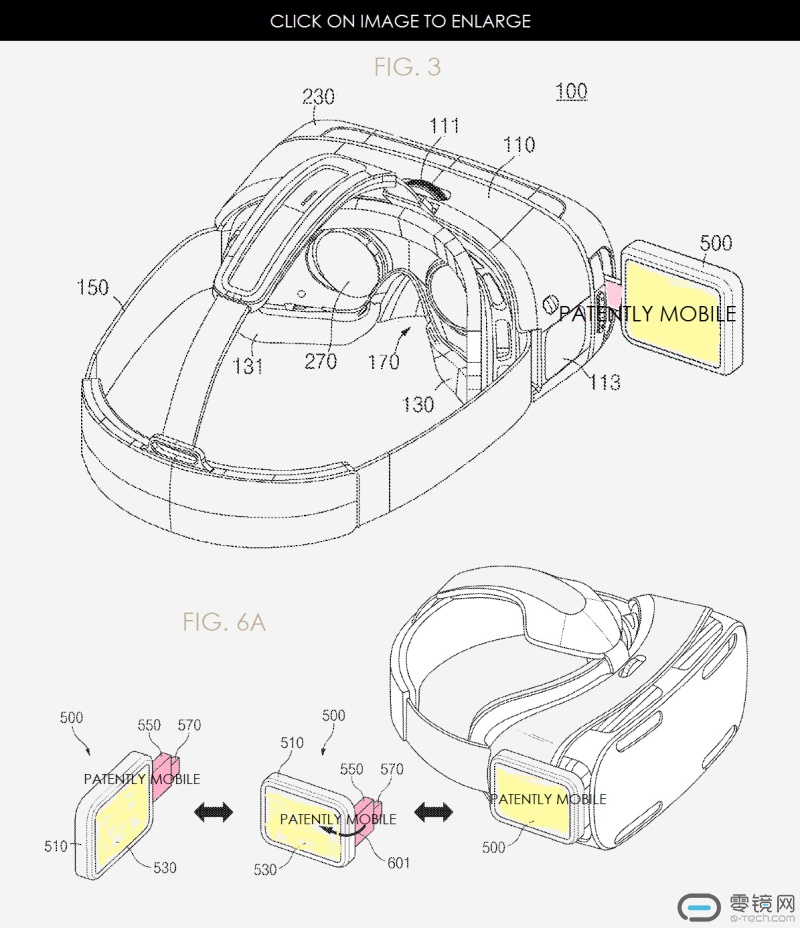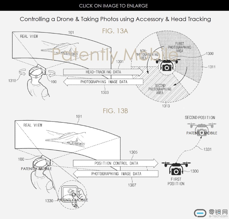 在专利图FIGS. 13A和13B中我们可以发现,用户能够简单地通过触控板点击Galaxy智能手机中的选项,或者是通过转动输入配件和移动头部来拍摄全景图片。当Gear VR面板转换成透明玻璃面板时,用户可以通过手指点击输入配件来拍摄图片。用户也可能通过这种方式来拍摄更稳定的全景图像或一般影像,因为这样他们就不再需要手持智能手机。当然,这样拍摄的代价是你看上去就像是一个十足的书呆子。