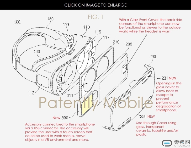以下的三个Gear VR新输入配件都是通过USB连接器接入Galaxy智能手机。新配件旨在为用户提供兼容应用程序和游戏菜单的免手操作触控屏输入,让其能够进行选择、移动对象或与对象进行交互。在专利图FIG. 6中可以看到,触控面板可以转动或折叠,这样用户就能以不同的角度操作配件。