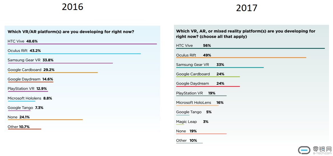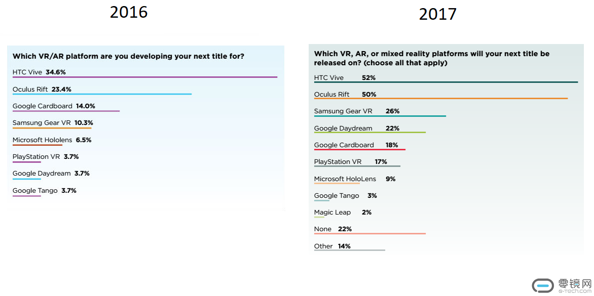 第二份报告搜集了致力于AR、VR、MR行业超过600名的开发者。在对比差异时也要注意到去年有超过500名开发者参与了调查。在今年的开发者中,56%声称正致力于Vive,然而49%声称致力于Rift。7%的差距比起去年5.4%的差距更大。PSVR也获得了一定增长,从12.9跃升至19%。谷歌Daydream平台和微软HoloLens都有所增加,但Gear VR的数据有轻微变化,从33.8%变为33%。