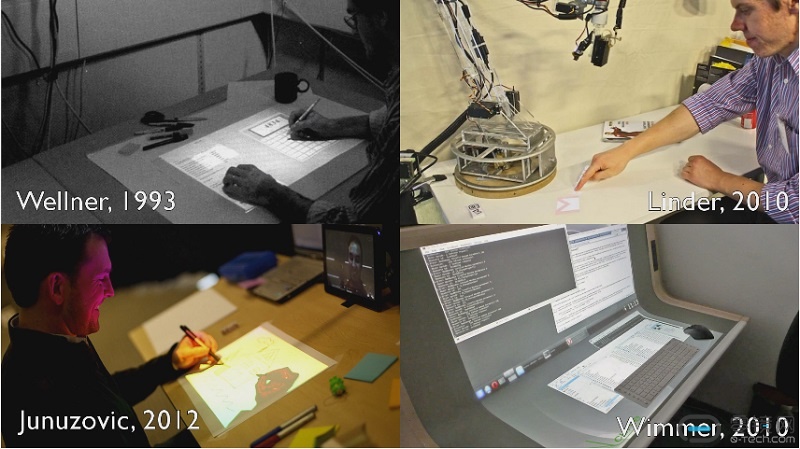 在Desktopography项目中,可以看到此前技术的积累。早在2016年他们就在探索新的交互方式。在他们之前,就早已有大量研究表明:深度摄像头加上投影仪能够使得任何平坦的表面成为一个对触碰敏感的显示屏。