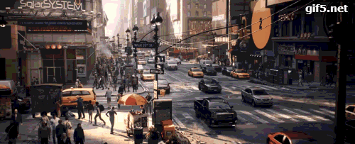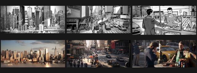 上面张GIF图展示了预告中纽约时代广场镜头的制作过程,完成品的繁荣街景在一开始也只是白茫茫的模型,制作人员还需要进行大量的工作来渲染和烘焙。