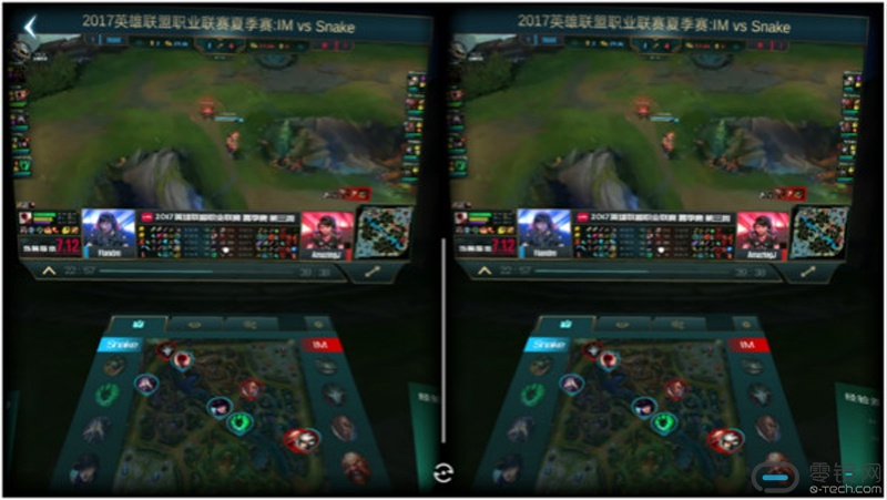 影院观赛模式就与各种VR头显中播放普通2D视频一样,主要是巨幕播放,不过《英雄联盟》为其做了很多优化,包括在巨幕下方加入了小地图,对局资料等。可以选择性的查看目前对局的资料和情况,这比较符合玩家的心里预期。因为玩家观看比赛的时候,想了解的信息可不只是导播切的画面。(像我就比较喜欢关注各比赛选手的经济发育)