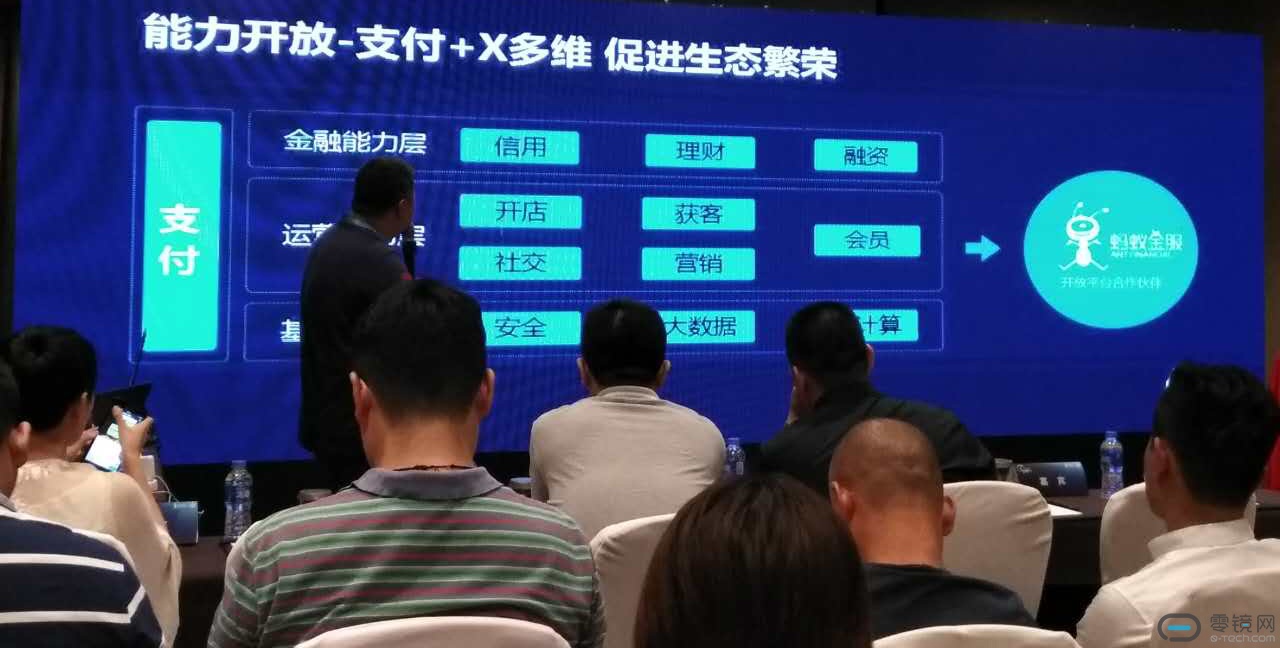 蚂蚁金服开放平台围绕核心支付能力,提供了金融、运营和基础三层服务生态。