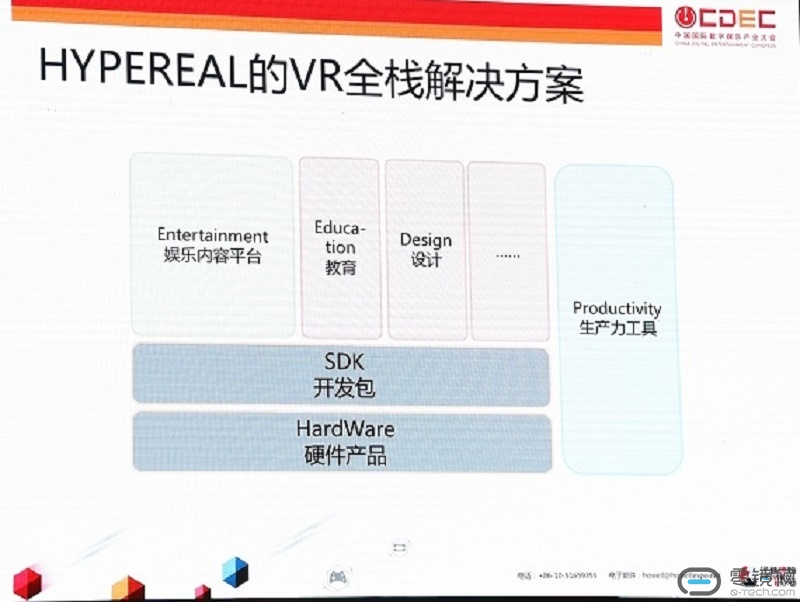 HYPEREAL副总裁罗继恩更详尽地展示了HYPEREAL硬件公司之外的身份,更拥有良好的软件团队,拥有自研的空间定位追踪系统、SDK等。此外HYPEREAL还因自己是全世界仅有的两家全栈公司之一而自豪。