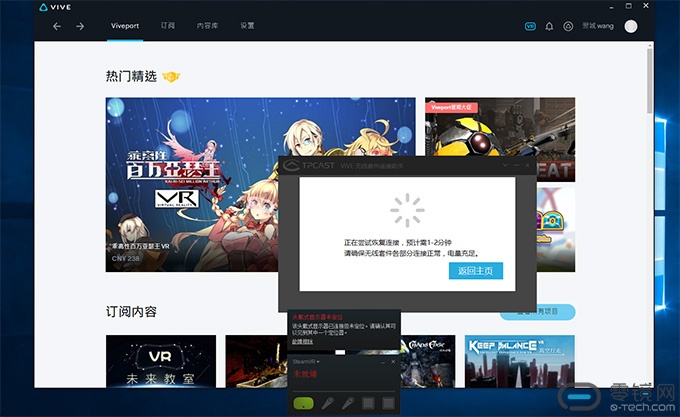 然而这个方法还是出现了问题,成功启动TPCAST和正常连接Steam(或VIVEPORT)你只能二选一。如果选前者,那么Steam或VIVEPORT只能工作在离线模式下,下载好的单机VR内容体验不受影响。但需要互联,拥有社交或在线服务的内容(如VR影视)则不要想了……