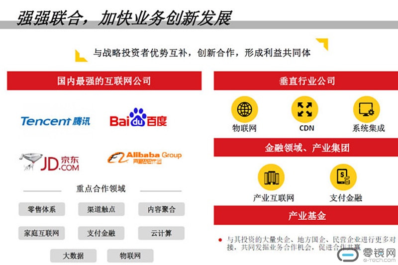 王晓初表示,联通与这四家公司的合作将各有侧重,强调强强联合、互利共赢。合作大致围绕业务层面,包括网络零售、金融支付、内容聚合、物联网、云计算与大数据等领域,联通将充分利用互联网公司带来的“触点”。据悉,8月16日中国联通已与腾讯、百度、京东、阿里巴巴等战略投资者就进一步合作签署了战略合作框架协议。相关合作也可能涉及成立合作公司,具体合作方案还需要进一步讨论。