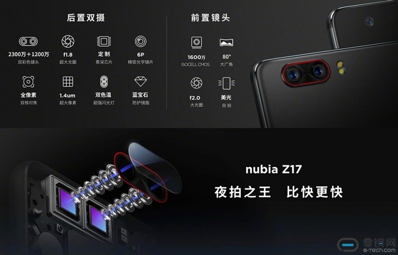 配置上,Z17搭载了高通骁龙835处理器外,内存组合是8GB RAM+64GB存储空间,运行Android 7.1.1系统,,内置2300万+1200万像素双后置摄像头。