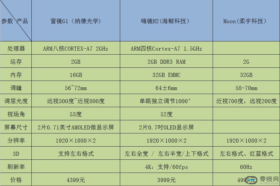 零镜网手中的产品GOOVIS窗镜G1、嗨镜H2、Moon均于2016年晚些时候推出。如今海鲸科技已经推出了新产品大画头显,与嗨镜H2相比有了很大不同,但仍旧采用相同架构处理器。柔宇也在最近推出了4G版本Moon。鉴于从未有将三款头戴式设备进行横评,零镜网做了一次尝试。