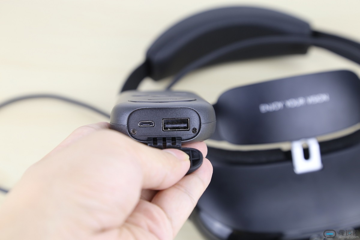 三者都采用分体式设计,以致于三者都拖着一条长长的尾巴,用来连接有着计算单元和供电单元的盒子。GOOVIS窗镜连接线位于右侧,左侧同等位置是其耳机孔。嗨镜连接线位于右侧下方边缘,耳机孔位于机身下方靠近该线部位。Moon的连接线线位于左侧耳机口上,而非机身上。