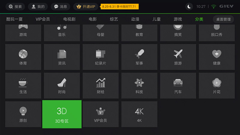 GOOVIS窗镜自带应用中并没有明显的3D分类。在“在线视频”(银河·奇异果应用)栏中“分类”栏的底部才出现了3D专区,目前也仅有200部电影。在其他应用中很难发现3D电影的接口。
