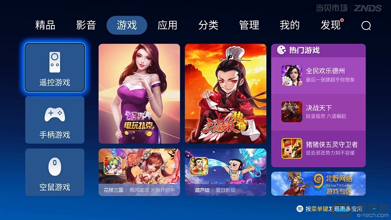柔宇设备中并没有游戏选项。但在当贝市场中,可以进行相关内容的下载。在游戏栏中,分有三种类别。由于不知道属于哪款,我们选择了遥控游戏。
