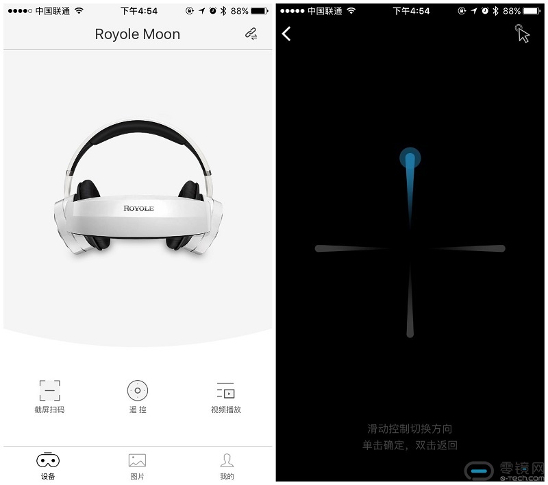 再来说说不同之处,GOOVIS窗镜、嗨镜在操作方式上基本依靠盒子。但柔宇的操控却在头戴设备右侧耳机触控屏上,通过手指滑动即可。双击返回,单击确认。但极可能出现误操作。此外柔宇还有着一款柔宇Moon的应用。官网并没有提供其接口,在应用商店中下载后,零镜网也进行了测试。其实就是将触控屏的操作挪移到移动设备上。当头戴设备出现损毁或失灵情形下,这倒是一个不错的补救措施。