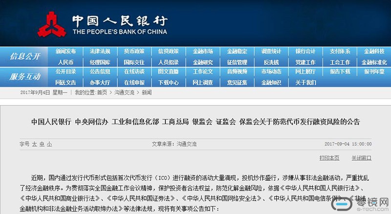 9月4日下午3点,中国人民银行在官方发布了《关于防范代币发行融资风险的公告》,直接宣布从公告之日起取缔各类代币的发行和交易活动。