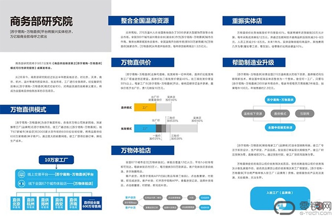 “万物直供”模式依托苏于宁易购线上设立万物直供交易平台,在线下67个城市设立“万物体验店”,由全国温商参与经营的3000家大型市场连接600万个零售店加盟线下销售平台产品,通过减少流通环节和成本,以 O2O 模式将产品由厂商直接供给到零售终端,产品直供价格比传统二级批发市场价格低40%以上。