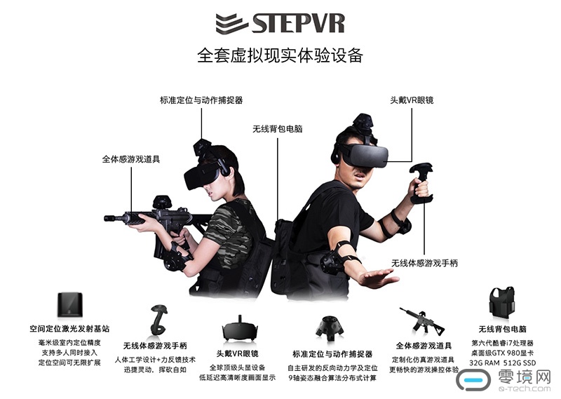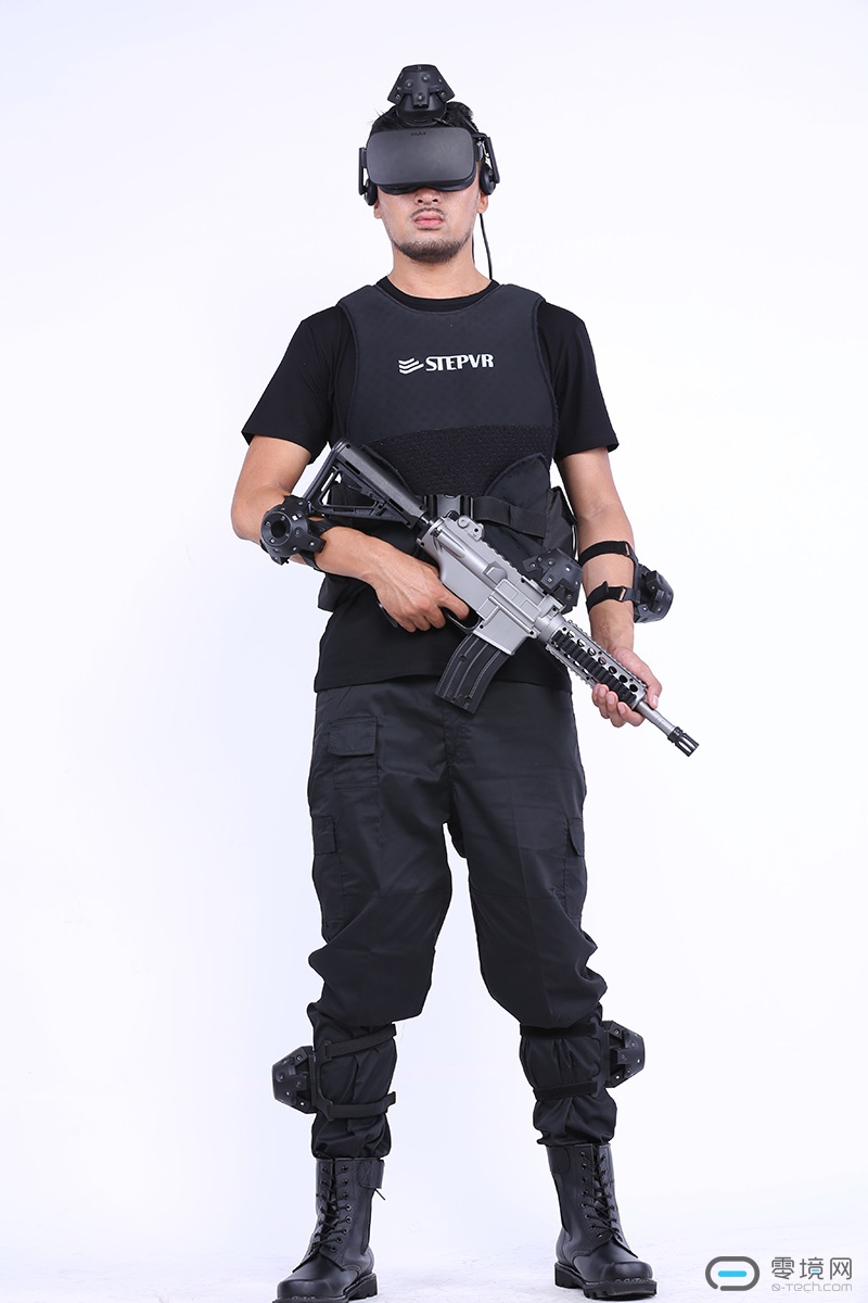 STEPVR的激光定位和动作捕捉技术,可精确读取玩家的位置和动作。以此为基础,搭配定制的背包式PC,摆脱了PC和头显之间还要连根“脐带”的限制,用户可在定位空间内自由行走。