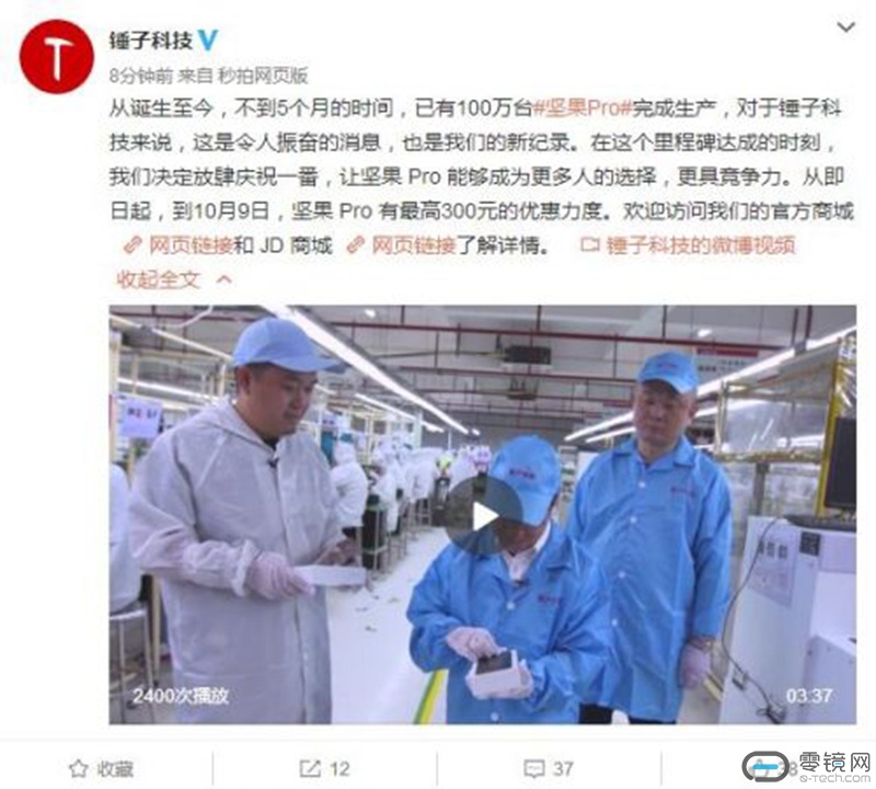 锤子科技官方微博今天上午宣布:为庆祝坚果Pro产量破百万,锤子科技决定“庆祝一番”,让坚果Pro能够成为更多人的选择,更具竞争力。