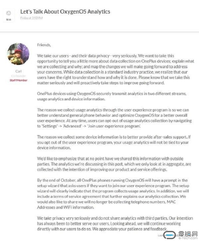 一加官方针对外媒置评并表示“我们通过HTTPS协议向一台亚马逊服务器安全地发送两个分析数据流。其一是用户使用情况,便于根据用户习惯,更精确地优化软件,可以在高级设置的加入用户体验计划处关闭。其二是服务信息,便于提供更好的售后支持。”