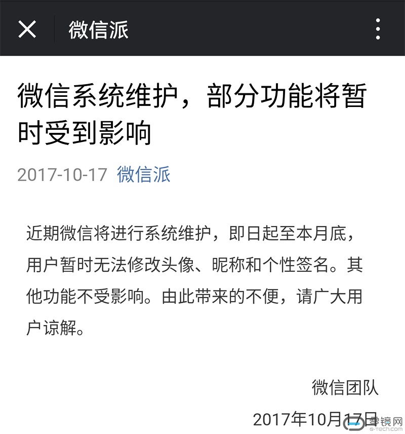 昨晚微信官方微信号“微信派”发布公告称,近期微信将进行系统维护,即日起至本月底,用户暂时无法修改头像、昵称和个性签名,其他功能不受影响。