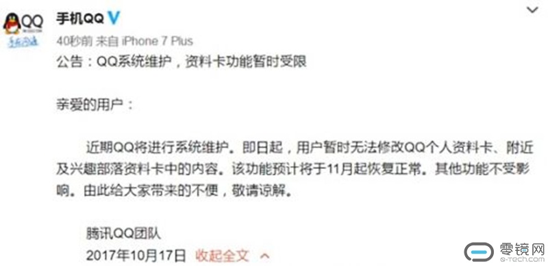 值得注意的是,在微信发布公告之前,手机QQ官方也对外发布公告称,QQ系统维护,资料卡功能暂时受限,月底前用户暂时无法修改QQ个人资料卡、附近及兴趣部落资料卡中的内容。下个月将恢复正常,其他功能不受影响。