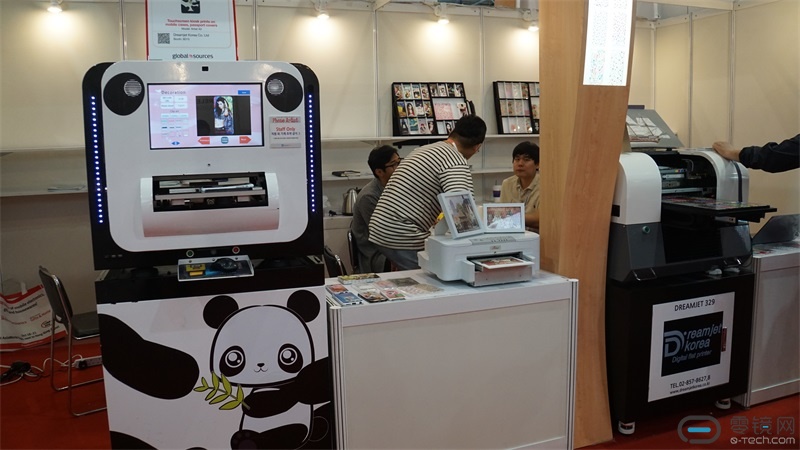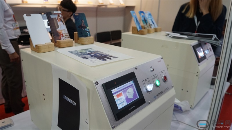 同样是印制图案,不同的是这家厂商选择印制私人订制图案。只要是平整的表面,它便可以让机身外套穿上彩妆。耗时也不长。最为神奇的是,这些图案并不是印上去的,而是热传导上去的。现场演示取出时,厂商正不断扇动着手中外壳散热。
