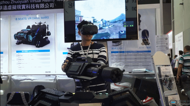 抛开大厂,现场随处可见VR盒子、VR眼镜,以及基于HTC Vive改造出的相应设备,比如下面这款能够不停转动的加特林炮。使用起来十分带感。