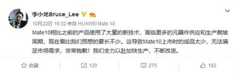 而官网缺货也不是华为主观原因造成的,华为手机产品线PDT经理李小龙在微博上对Mate 10的备货问题作出了回应:“Mate 10相比之前的产品使用了大量的新技术,面临更多的元器件供应和生产爬坡周期,比胡伟预想的要长不少。这导致Mate 10上市时的成品太少,无法满足市场需求。并承诺,华为将全力以赴加快生产,不断改进。”