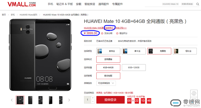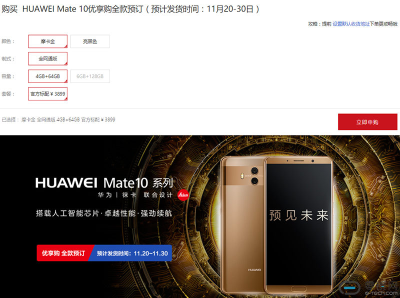 如果实在想入手华为手机,又不想每天准点去拼手气抢购,小编这有个渠道安心省事。华为上线了Mate 10优享购全款预订,时间为:10月25日22:40至10月26日22:00,活动结束后,将不能提交订单。可选3899元4+64GB的摩卡金/亮黑色,支付全款后就可以在11月20日到30日期间到货。