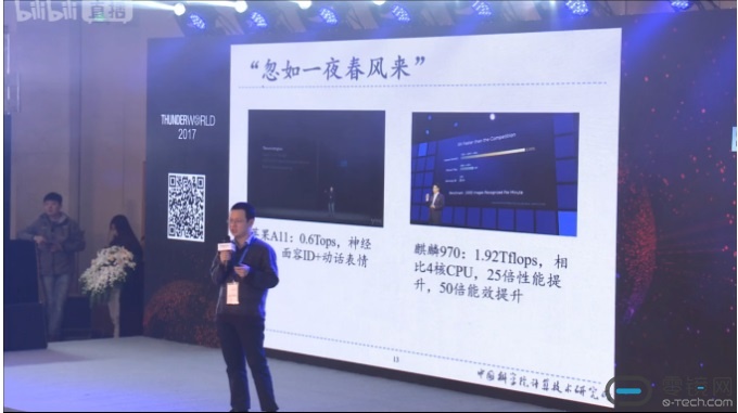 寒武纪正在开发深度学习处理芯片,国际巨头也在关注这一领域。陈云霁在现场甚至笑称“陈天石应该会感到忧虑”。现场,其展示了苹果A11芯片和麒麟970芯片的对比,并表示产品前期可能有两三年的准备,目前实验室的性能可能会比上述芯片更好。但比起堆硬件,陈天石表示生态更为重要。