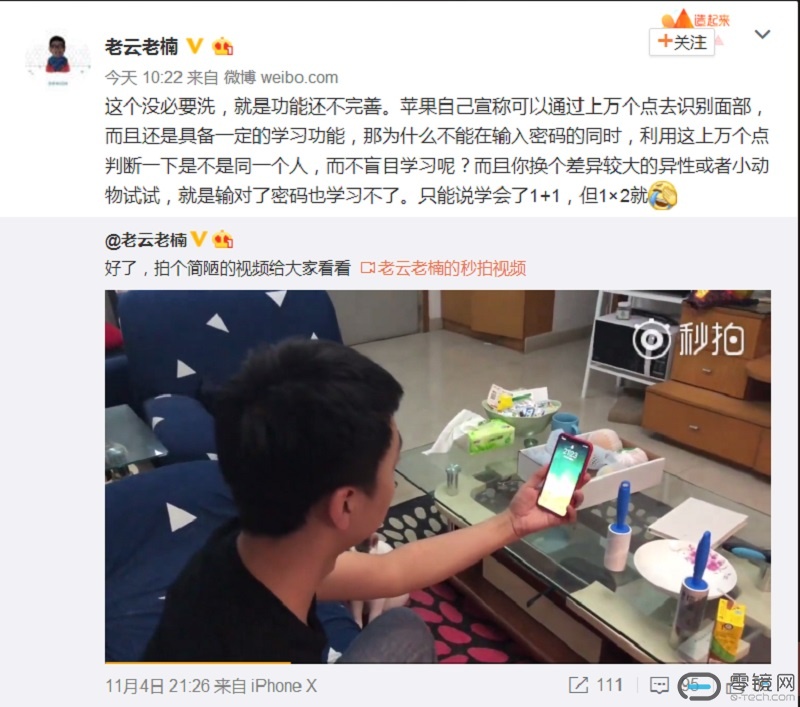 那么问题来了,如果确实是亲密的人,想要让他也能够使用上自己的iPhone X该怎么办呢?新浪知名数码博主“老云老楠”,意外发现的一个漏洞或许很好地解决了这个问题,让两张完全不同的面孔能够解锁同一台iPhone X。那么他是怎么做到的呢?